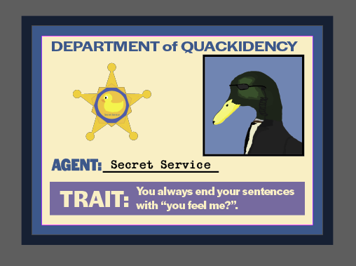 For one thing, the badge itself has text on it. It's a bit hard to read in that image, but it's there. Since it's integrated into the art, it's not important to look at. But, we do have the words "DEPARTMENT of QUACKIDENCY". This also uses the Halyard Display font, but in its semibold style which makes it distinct from the words "AGENT" and "TRAIT". This text is not important for the readers at all which is why that line isn't fully in uppercase and the text is has been scaled vertically as well. So readers will also end up looking at it, but because of those distinctions and looking at the rest of the card, they won't focus on it for much longer than is necessary.